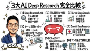 Grok DeepSearch・Gemini Deep Research・ChatGPT Deep Researchに同じ質問を投げて徹底比較。7つの論点で横断検証した結果、3つとも得意分野が全く違うことが判明。テーマ別の使い分けガイド付き。