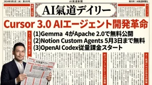 Cursor 3.0がエージェントファーストIDEとして登場、Google Gemma 4がApache 2.0で無料公開、Notion Custom Agentsが5月3日まで無料で使える。OpenAI Codex従量課金化やClaude Code漏洩続報まで、2026年4月3日の最新AIニュースを料理に例えてわかりやすく解説します。