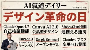 Claude Opus 4.7が自己検証機能で長文ライティング革命、Canva AI 2.0は会話型・agentic orchestration対応、Adobe Creative Cloud AI Assistant×Claude連携でクリエイティブ自動化、Cursor 3・Google Gemma 4・Anthropic Claudeサブスク変更(4/17期限)まで6本解説。