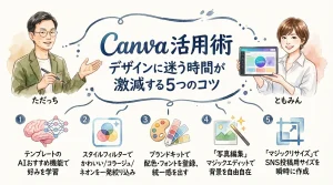 プロのCanva活用術を、GPTs研究会LIVEのともみん×ただっち対談から5つのコツに凝縮。テンプレートのAIおすすめ機能、スタイルフィルター、タグ確認術、お気に入りストック、AI画像生成に効くデザインの語彙力まで。デザインに迷う時間が激減する実践法を紹介。