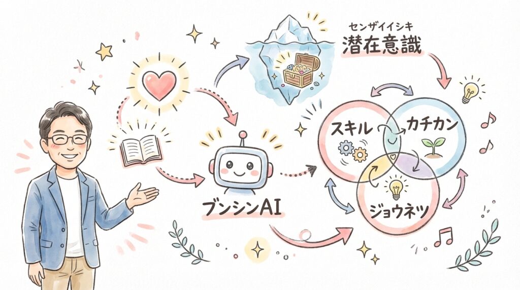 この「言語化」のプロセスをAIと一緒に進めることで、客観的な視点が加わり、より深く、より広い視野で自分を見つめ直すことができるよ。