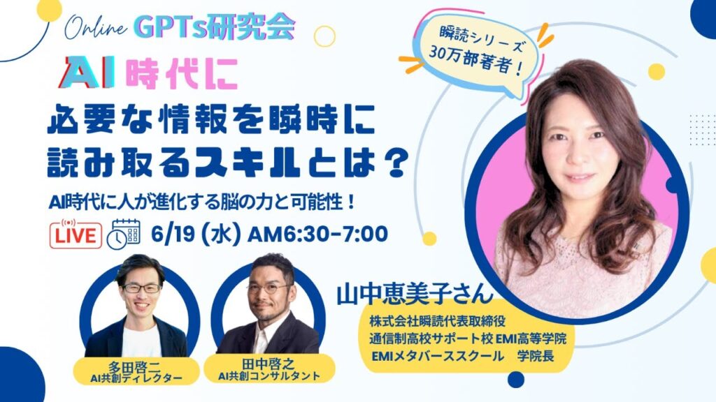 今回のGPT研究会モーニングライブには、「瞬読」著者の山中ゆみ子さんをゲストにお迎えした。山中さんは本を9冊、累計31万部出版している著者であり、塾・予備校・オンラインフリースクール・通信制高校(エミ高等学院)を同時に経営する教育者だ。