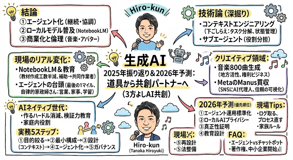おはようございます、田中啓之(ひろくん)です。今日は一年の締めくくりとして、激動の2025年に起きた生成AIの大きな変化と、私が実務家・主夫社長として肌で感じた「現場のリアル」を整理しておきますよ。家族第一で働き方を再設計してきた私の視点から、明日から使える現場のヒントと、次の一年に向けた実践的な予測をシェアしますね。