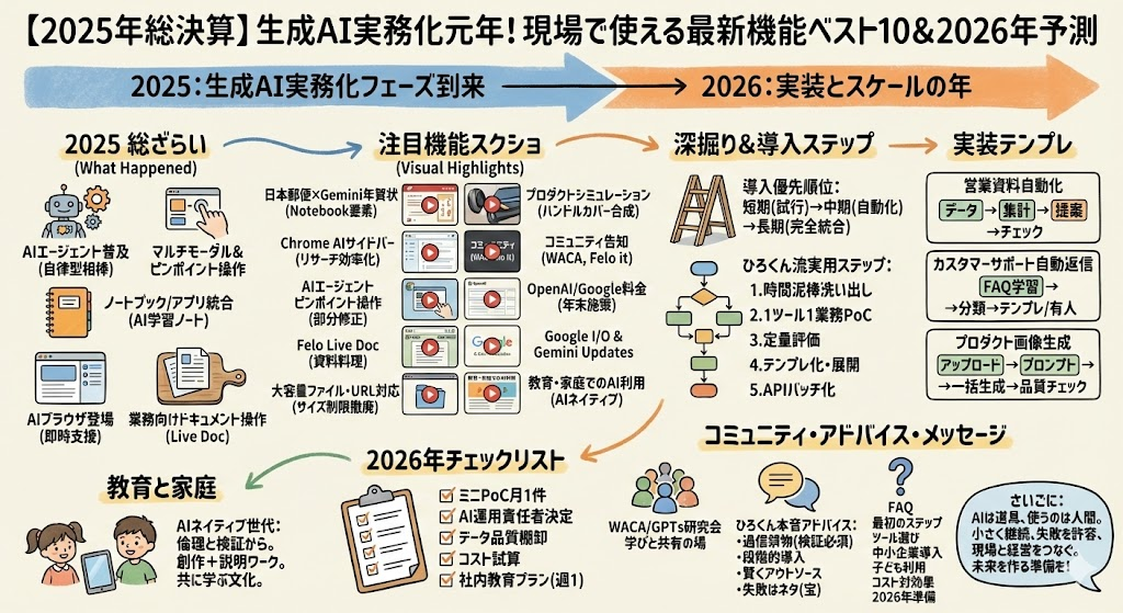 おはようございます、田中啓之(ひろくん)です。年末の朝に30分で駆け抜けた「年末生成AIスペシャル会」を、私なりの視点で整理しましたよ。2025年は生成AIが怒涛のアップデート連発で、仕事・学び・発信のやり方がガラリと変わった一年でした。ここでは重要トピックの解説、実務で使える具体策、2026年に備えるチェックリストまで、実践的にまとめます。では行きますよ〜😊