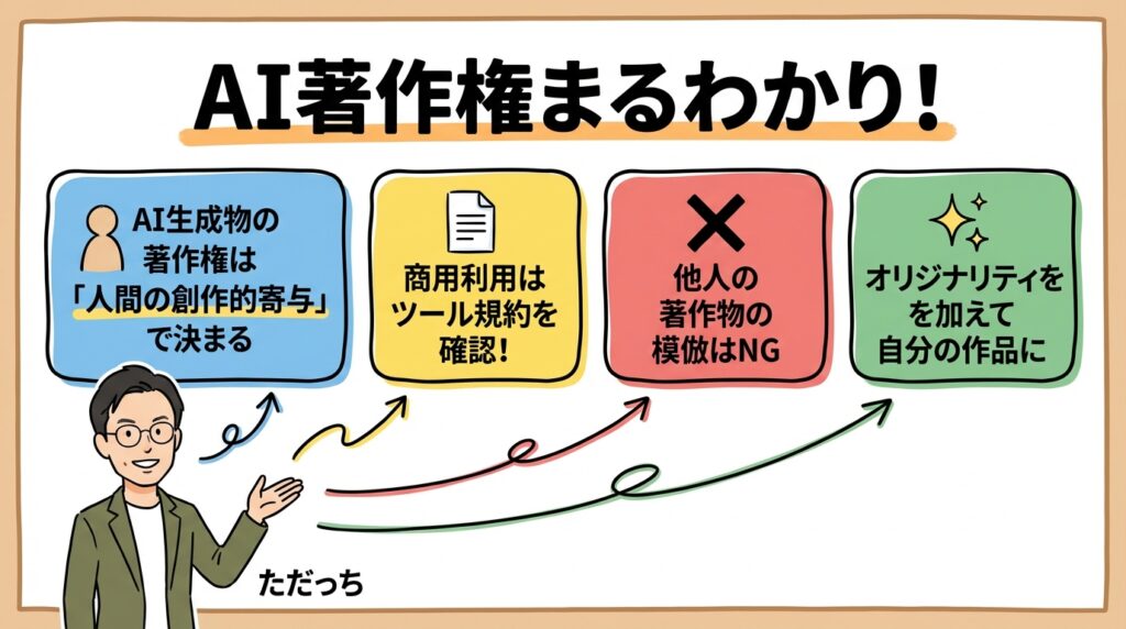 【AI著作権の基本】AIで作ったものの著作権はどうなってるの?商用利用OK/NGの境界線を解説 2025年3月31日 最新AI情報満載!毎日無料朝LIVE実施 【AI著作権の基本】AIで作ったものの著作権はどうなってるの?商用利用OK/NGの境界線を解説 Read Post »