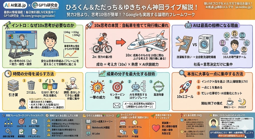 こんにちは、田中啓之(ひろくん)です。3方よしAI共創コンサルタント兼おうちCEOとして、AIと共に「あなたが頑張らなくても回る仕組み」を作るのが仕事です。今回は、私のビジネスパートナーである多田啓二(ただっち)さんと相田ゆきちゃんが開催した神回ライブを元に、AI×10x思考の本質を徹底解説します。