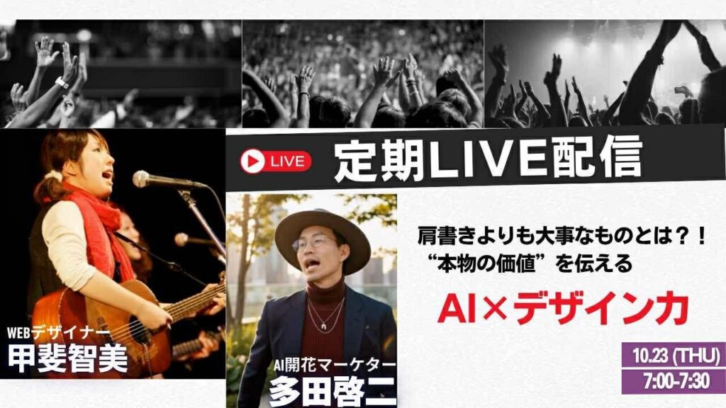 こんにちは、田中啓之(ひろくん)です。今回は「肩書きを超えて本物の価値をどう伝えるか」について、私が普段考えていることや、今回のトークで印象的だった「AIとデザインの接点」について、具体的に掘り下げていきますよね。肩書きは名刺の一部にすぎない。大事なのは、あなたの「想い」と「表現力」がどれだけ届くか。AIはその表現を増幅する手段になれるんだよ、って話をしていきます。
