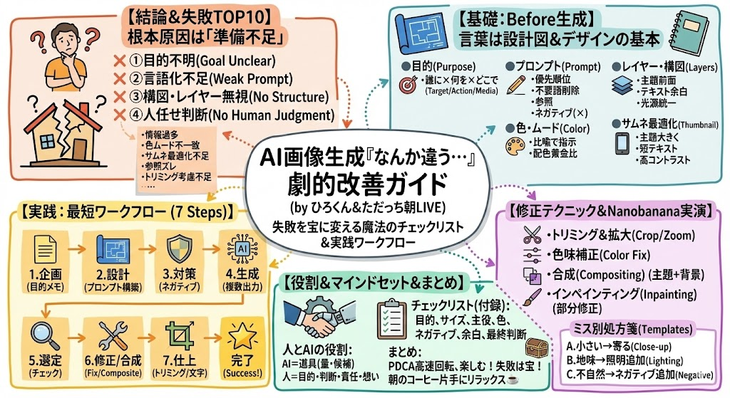 私自身、数え切れないほどの失敗(エラー)を宝に変えてきた経験から、デザイン×AIの現場で本当に効く「魔法のチェックリスト」と、多田啓二(ただっち)とのライブNanobanana実演で見えた“失敗の共通パターン”を、料理のレシピのようにわかりやすく整理しました。朝のコーヒー片手に、リラックスして読んでくださいね☕️