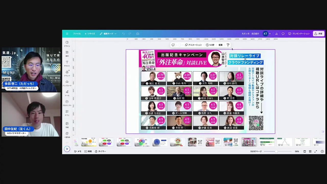 ここでは当日のテーマ「AIで業務革命、仕事をカイテキにして時間短縮」が提示されています。会議やライブの冒頭でテーマを明確に示すことは、参加者の期待値を整え、議論の焦点を合わせる上で極めて重要です。これを当たり前にやるだけで会議の密度が変わりますよね。
