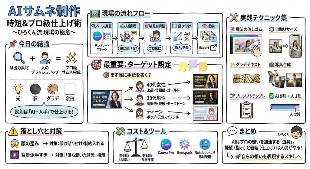 - 時短のコツ:Canva(キャンバ)などの既存テンプレートから作るか、ゼロからAIで作るかで工程が変わる。テンプレは「レトルト活用」のように早いが自由度は下がる。