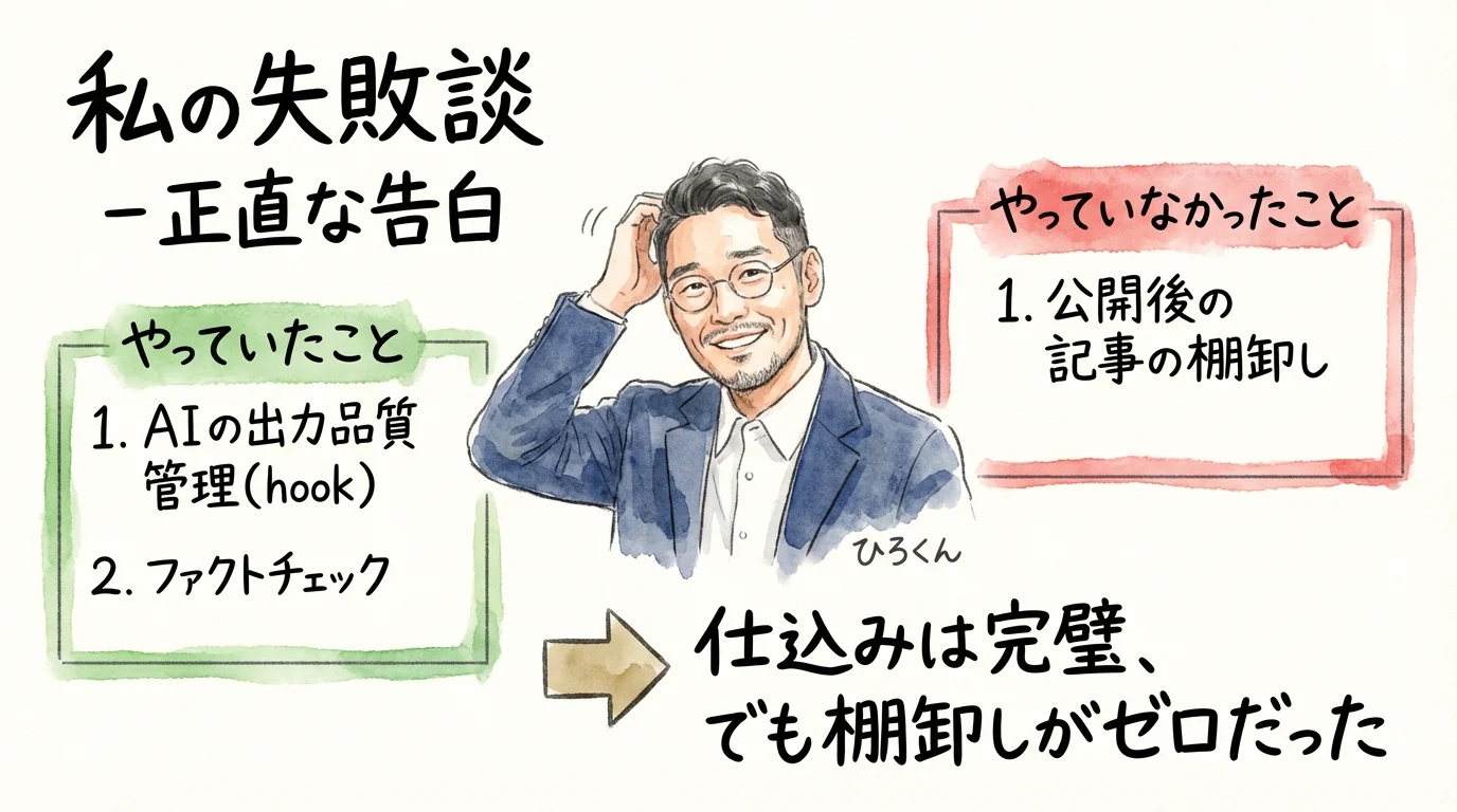 私は3サイトで月70本以上の記事を出している。164個のスキルと102個のhookで品質管理を自動化しているし、ハーネス設計で結果が別物になるという記事も書いた。AIの品質管理については、かなり意識している方だと思っていた。
