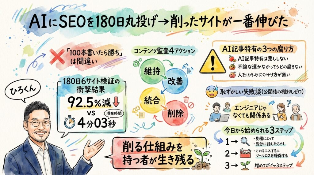 先日、SEO歴約20年の実践者(SEOタイガー氏)が、Claude Codeに6つのサイトのSEOを180日間丸投げした検証結果を公開した。3サイトが成功し、3サイトが壊滅。その差は「記事の質」じゃなくて「品質管理の仕組み」にあった。