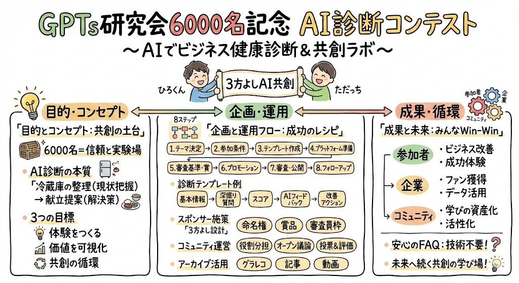 今回は、その感謝を形にするために「AI診断コンテスト」を企画しました。この企画は、単なるお祭りではありません。「AIを使ってビジネスの課題をどう解決するか?」を可視化する、まさに「ビジネスの健康診断(人間ドック)」のような実践的な場です。