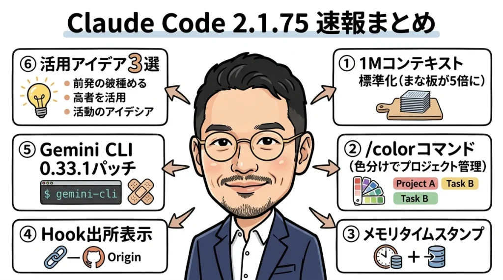 2026年3月13日、Claude Code 2.1.75がリリースされました。目玉はOpus 4.6での1Mコンテキストウィンドウの標準化。同日、Gemini CLIも0.33.1にパッチ更新。Codex CLIは変更なし。今回はClaude Codeの大幅アップデートを中心に、凛×ひろくんの対話形式で解説していきます。