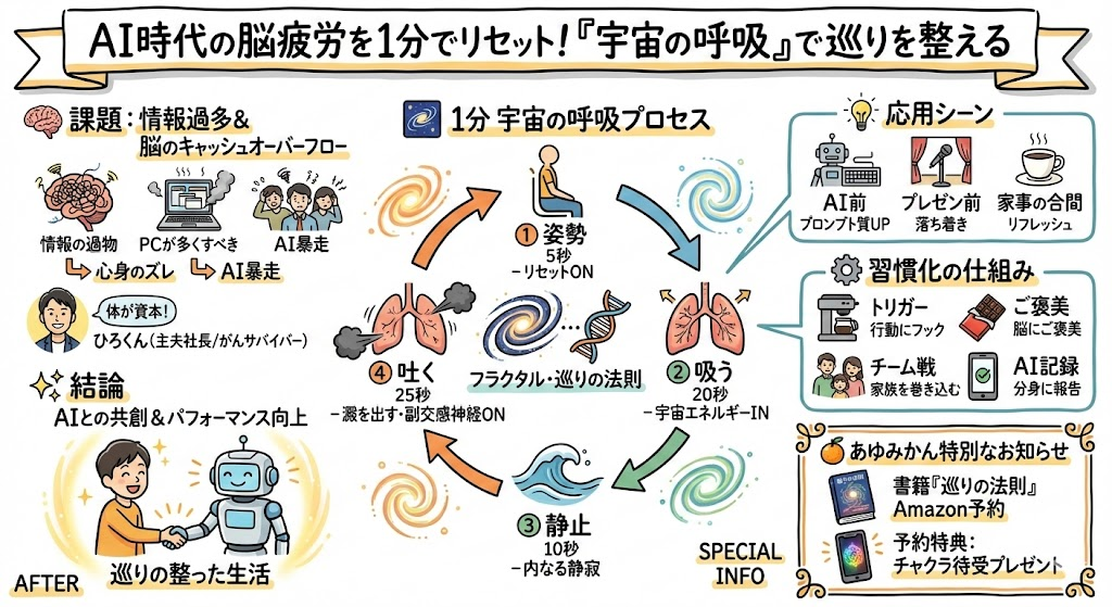 健康を害し、一度立ち止まった私だからこそ言えます。「1分の呼吸」は、自分自身への最短・最安の投資です。まずは今日、PCを開く前の1分から始めてみてください。あなたの「巡り」が整えば、AIもビジネスも、きっともっとうまく回ります。応援しています!