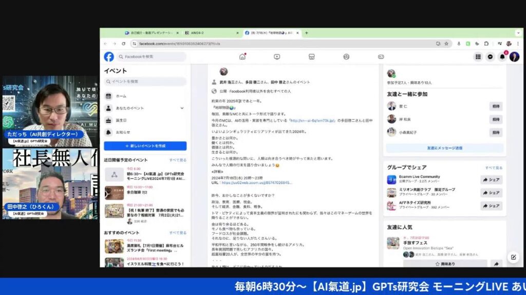 おはようございます!毎月恒例、月初の月曜日は「GPTs研究会モーニングLIVE」の日です。今回も、一般社団法人ウェブ解析士協会(WACA)理事の積高之さん(積さん)と一緒に、最新のAI事情やこれからのワクワクする未来について語り合いました。
