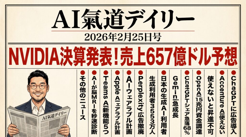 今日のAI界は、まさに「お品書きが全部変わったのに、常連客だけが気づいてない居酒屋」みたいな日だよ。NVIDIA決算で業界全体の体温がわかったり、ChatGPTに広告が入ったり、大企業がAIを使えないと昇進させないって言い始めたり。世界の料理人(AI業界)が一斉にメニューを書き換えてる最中に、私たちは何をオーダーすればいいのか——そこを今日は一緒に整理していくね!