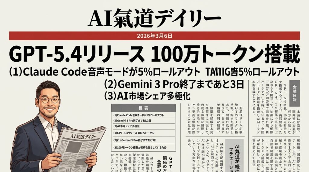 今日のAI界は、まさに「フルコース料理のメインディッシュが3品同時に運ばれてきた」みたいな日だよ。OpenAIがGPT-5.4で「全職業の83%を超えるパフォーマンス」を叩き出し、Anthropicは Claude Codeに音声モードを導入、そしてGoogleはGemini 3 Proの強制移行を3日後に控えている。
