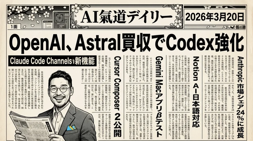今日のAI界は、まさに「厨房の大改装が始まった日」みたいな日です。OpenAIがPython開発ツールのAstralを買収してCodexを強化し、Claude CodeにはChannelsという「リモート指示」機能が登場。Cursorも独自AIモデルを公開し、GeminiはMac専用アプリのベータテストを開始した。