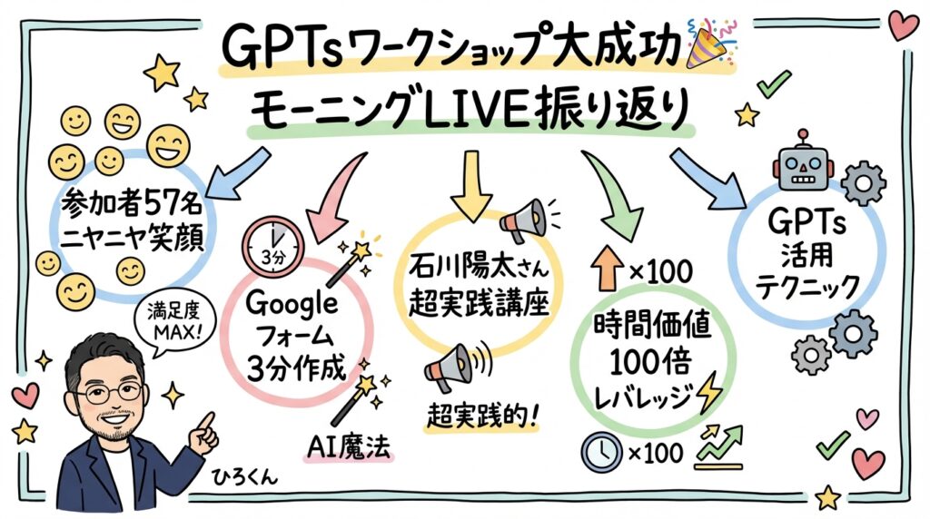 GPTs研究会モーニングLIVE – 昨日のGPTsワークショップ振り返り【2024年5月10日】 2024年5月11日 / GPTs研究会 おはようございます!ひろくんです。 【参 GPTs研究会モーニングLIVE – 昨日のGPTsワークショップ振り返り【2024年5月10日】 Read Post »
