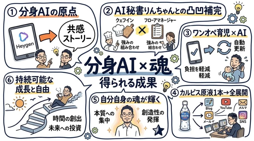 - ワンオペ育児×40度の発熱でもブログ更新——息子が40度の熱を出したワンオペの日でも、分身AIが勝手にブログも動画も更新してくれた。これが「魂を宿したAI」の威力だよ。