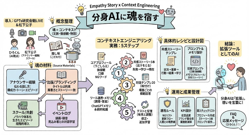 松下さんの「選ばれる話し方」や「共感ストーリー」は、実はそのまま良質なAIの学習データ(コンテキスト)になるんです。出版やスクール運営の経験をどうやってAIに落とし込むか、共感ストーリー×コンテキストエンジニアリングの視点で、実践的な手順とすぐ使えるテンプレートまで全部まとめましたよね。