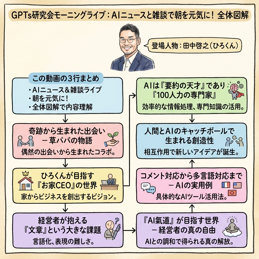2024年9月12日のGPTs研究会モーニングLIVE振り返り。AI成熟度で日本が最下位の理由とは?テレビ制作現場でのAI活用事例や、最新のインフォグラフィック作成ツールを実演。作業と業務の違いを理解してAIと共創しよう。