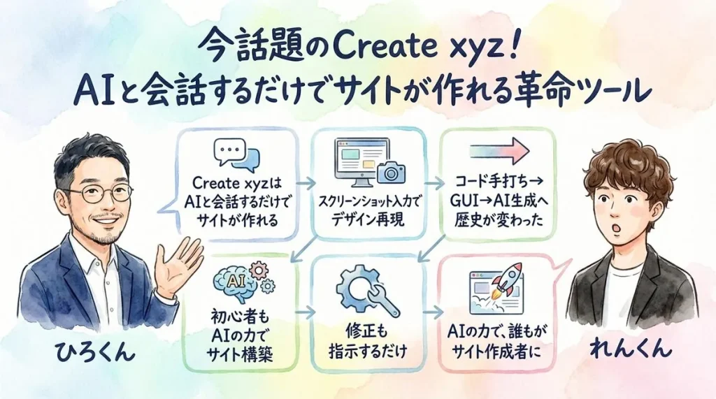 2024年4月4日のGPTs研究会朝LIVE配信を完全レポート。今話題のCreate xyzをひろくんとれんくんが実演。AIと会話するだけでWebサイトが作れる革命ツールの使い方、プログラミングの歴史的転換点、隙間時間でAIコンサルする新しい働き方まで徹底解説。