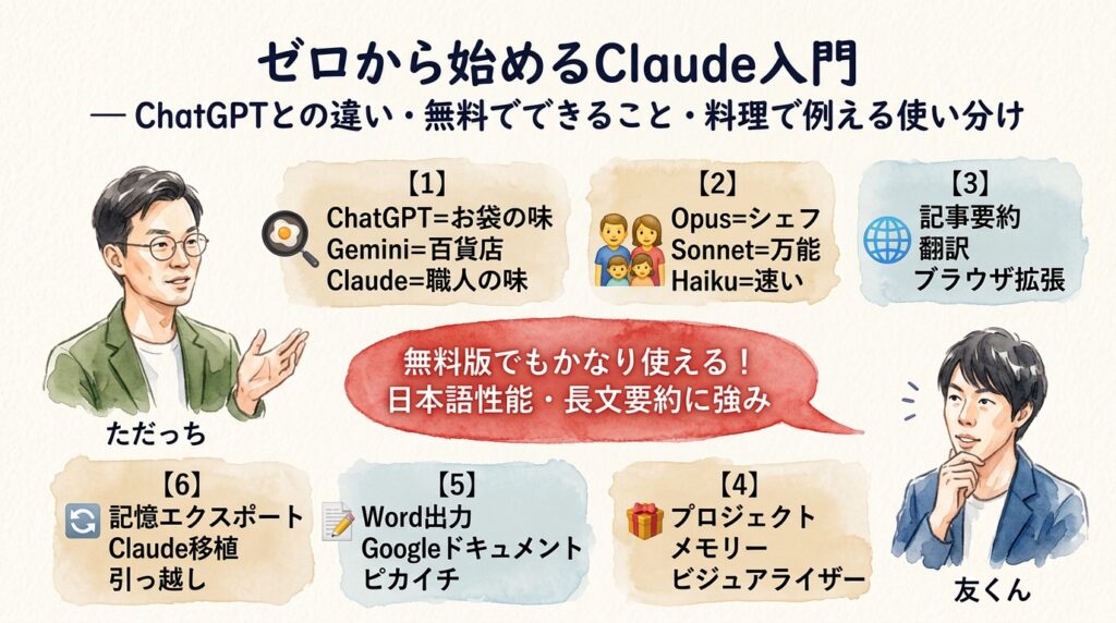 Claude入門ガイド|ChatGPTとの違い・無料でできること・料理で例える使い分け