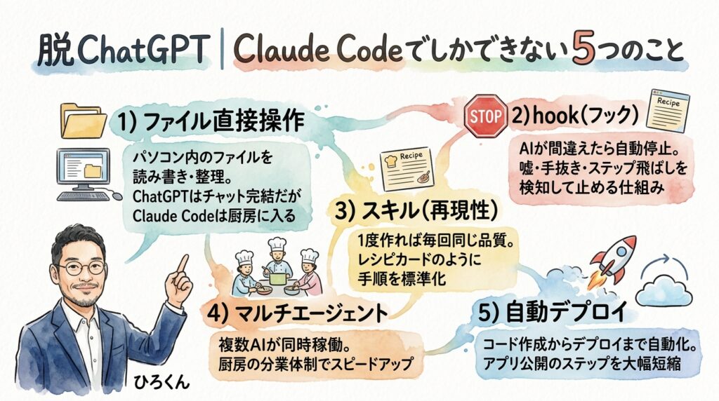 - 料理で言うと、ChatGPTは「出前の注文」。Claude Codeは「自分の惣菜屋の厨房を持つ」こと