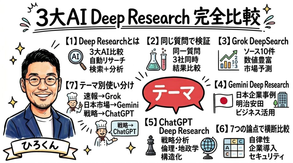 今回、Grok・Gemini・ChatGPTの3大AIにまったく同じ質問をDeep Researchで投げて実検証した結果、得意分野がきれいに分かれていることがわかった。