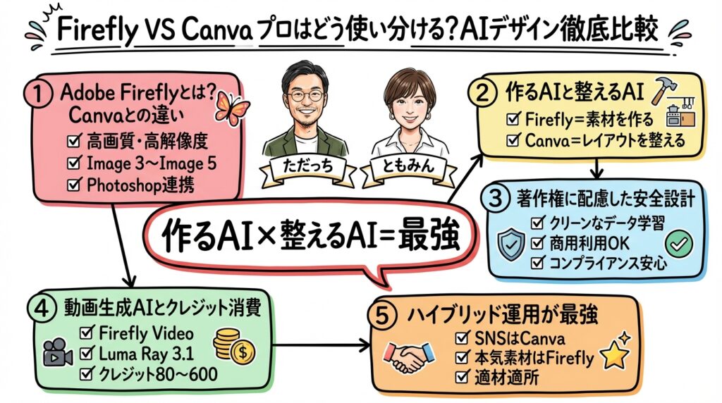 ただっちとともみんの対話で非常に面白かったのが、AIデザインツールにおける役割分担の話。「Canvaは整えるAI、Fireflyは作るAI」という明確な定義が語られていたんだ。