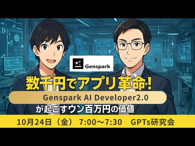 おはようございます、田中啓之(ひろくん)です。今回の配信は「Genspark(ジェンスパーク)」の最新アップデート、AI Developer 2.0を徹底的に触って、実際にアプリを「一発」で作ってみたライブ内容の書き起こし+補足解説です。僕は主夫社長として日常的にビジネスや教育現場でAIを活用してきた経験から、技術の実務的な活かし方と注意点を忖度ゼロで、でも優しく丁寧に解説しますよね。