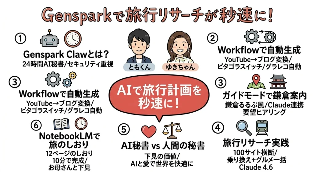 おはようございます!友くんとゆきちゃんがお届けする今回は、Gensparkで旅行リサーチを秒速で終わらせる方法を実例たっぷりでお届けします!