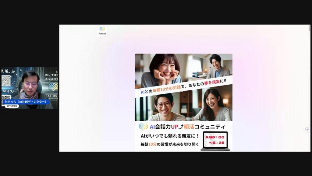 たちさんが運営するAI朝活コミュニティは、この回の時点で100日以上継続中でした。毎朝6時〜6時25分、ChatGPTと対話しながら「前日の振り返り」「今日の目標設定」「感情の言語化」を行うワークです。