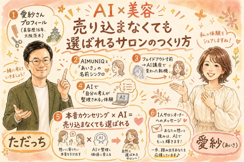 - AI苦手はスタートライン:愛紗さんは「ボタンしか押せない」から始まって、今は1人サロンオーナーを支える講師になっている