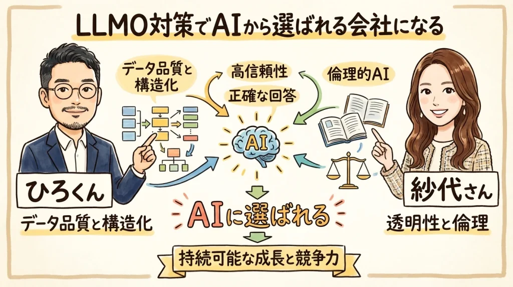 LLMO対策は「AIがどこから情報を学習しているか」を知るところから始まる。紗代さんが丁寧に解説してくれたこの部分は、戦略を立てる上で最も重要な基礎知識だ。