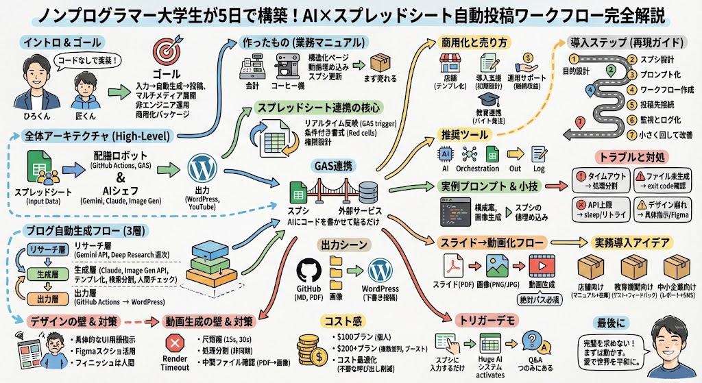 「AIで自動化したいけどコードはちょっと…」という声は本当に多いです。私は中卒でWEBも独学で覚えた身なので、その気持ちはよく分かる。今回の話は、コードがほとんど(あるいはほぼ)分からない人でも実装できるレベル感を狙っています。実際、大学1年生の匠くんが2週間(実質5日間の集中開発期間)で、業務マニュアルからブログ自動投稿システムまで作り上げました。彼が「クリスマスをAIと過ごした」成果、素晴らしいポテンシャルですね。