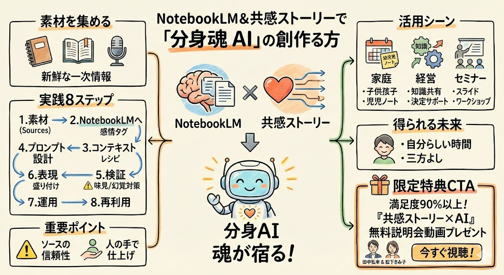 今回は、田中啓之(ひろくん)がお届けする朝LIVEの内容から、NotebookLMを中心に「共感ストーリー」を軸に分身AIへ“魂”を宿す実践的な方法を整理しました。