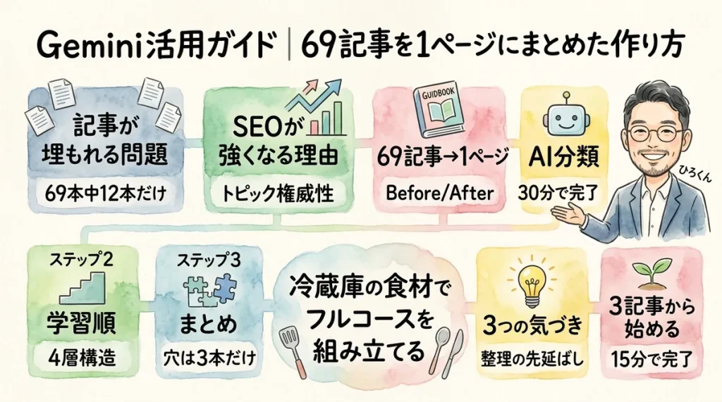 新しい記事を書く必要はない。今ある資産を並べ替えるだけで、サイト全体の評価がガラッと変わる。その方法を、実際に69記事を1ページにまとめてGemini活用ガイドとして公開した工程とともにお話しします。