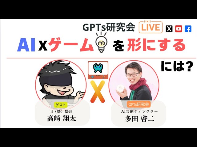 山﨑琢己(たくみくん)と高崎翔太(ゲタバコ先生)が語る、AIを活用した子どもの才能開発。絵が得意な子の作品を3D化・ゲーム化してモチベーションを高める方法や、AI時代の新しい教育の形を実演を交えて解説します。